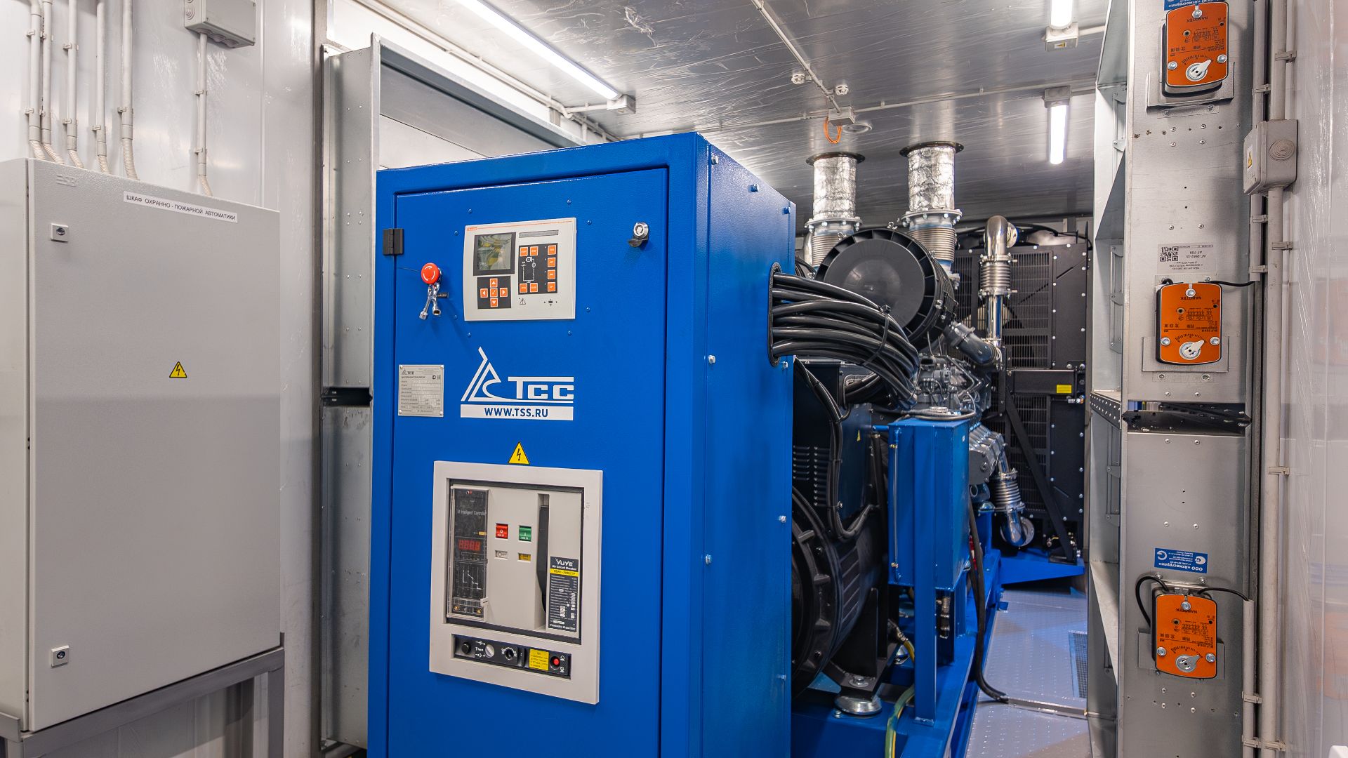 На мясоперерабатывающий завод были поставлены две дизельные электростанции модели ТСС АД‑1000С‑Т400‑1РМ9 (LA) PMG мощностью 1 000 кВт каждая. Станции синхронизированы и работают как единый энергокомплекс, размещены в контейнерах ПБК 8, что обеспечивает их работоспособность в сложных эксплуатационных условиях. Установки отличаются высокой наработкой — свыше 5 200 часов в год — и могут функционировать как в режиме основного, так и в режиме резервного источника питания: при отключении внешней сети происходит автоматический запуск и переключение нагрузки, а при восстановлении централизованного электроснабжения система автоматически останавливается. Гарантийный срок эксплуатации составляет 3 года или 2 000 моточасов (в зависимости от того, какое событие наступит раньше). Управление осуществляется через интеллектуальный контроллер Lovato RGK800 с русскоязычным интерфейсом, который позволяет в реальном времени отслеживать ключевые параметры работы электростанции и внешней сети, обеспечивать защиту при аварийных ситуациях и гибко переключаться между режимами работы.